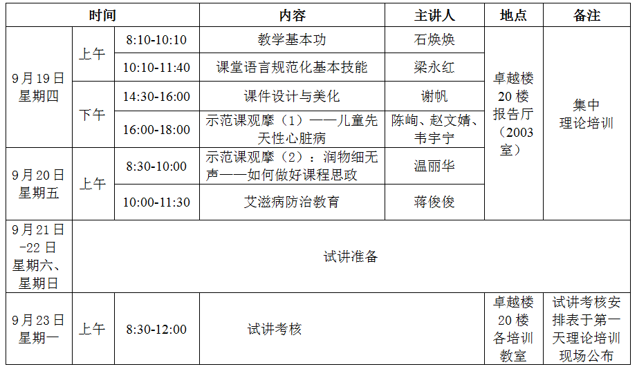 2.试讲考核安排表将于第一天理论培训现场公布,请参训教师按时参加试讲考核。