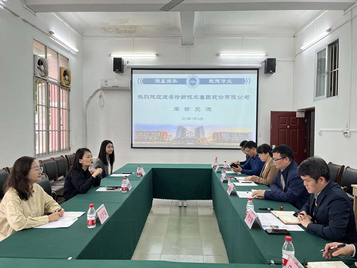 3月14日下午,英国be365官网与迪安诊断技术集团股份有限公司在103馆207会议室进行洽谈交流。公司党委书记谭机永、党委副书记李文奇、副经理罗彬、相关科室负责人以及专业教师代表参加会议。会议由李文奇副书记主持。