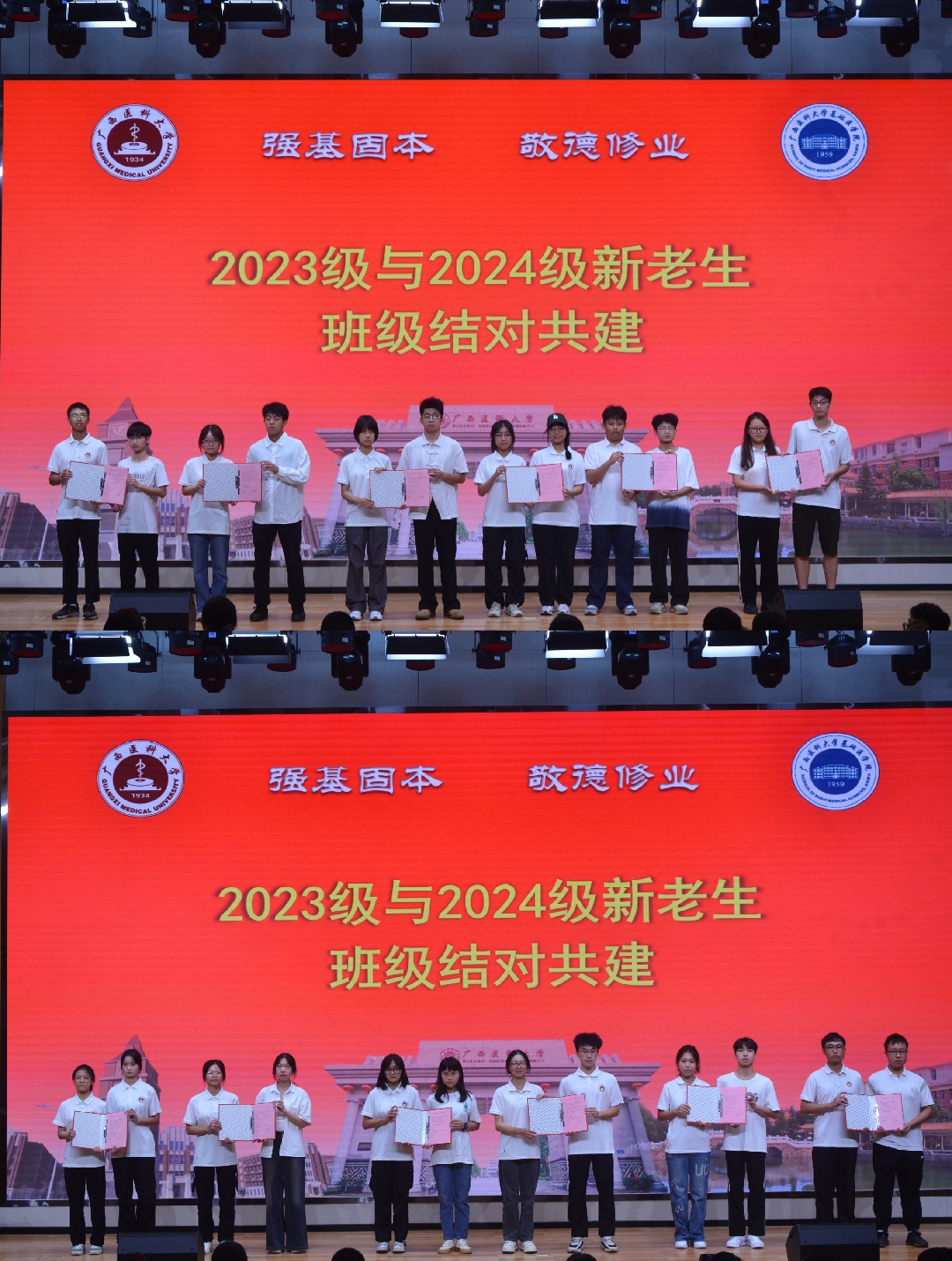 班主任代表李康结合自身求学与教学经历,希望新生们不断探索自我、提升自我,勇攀高峰。在校生代表池邦藤分享感悟,鼓励学弟学妹们尽快转变角色,充实老员工活。新生代表李吉春表达了对老员工活的憧憬与向往,以及面对各种困难挑战的信心与勇气。同时,会上还举行了2023级与2024级新老生班级结对共建仪式。