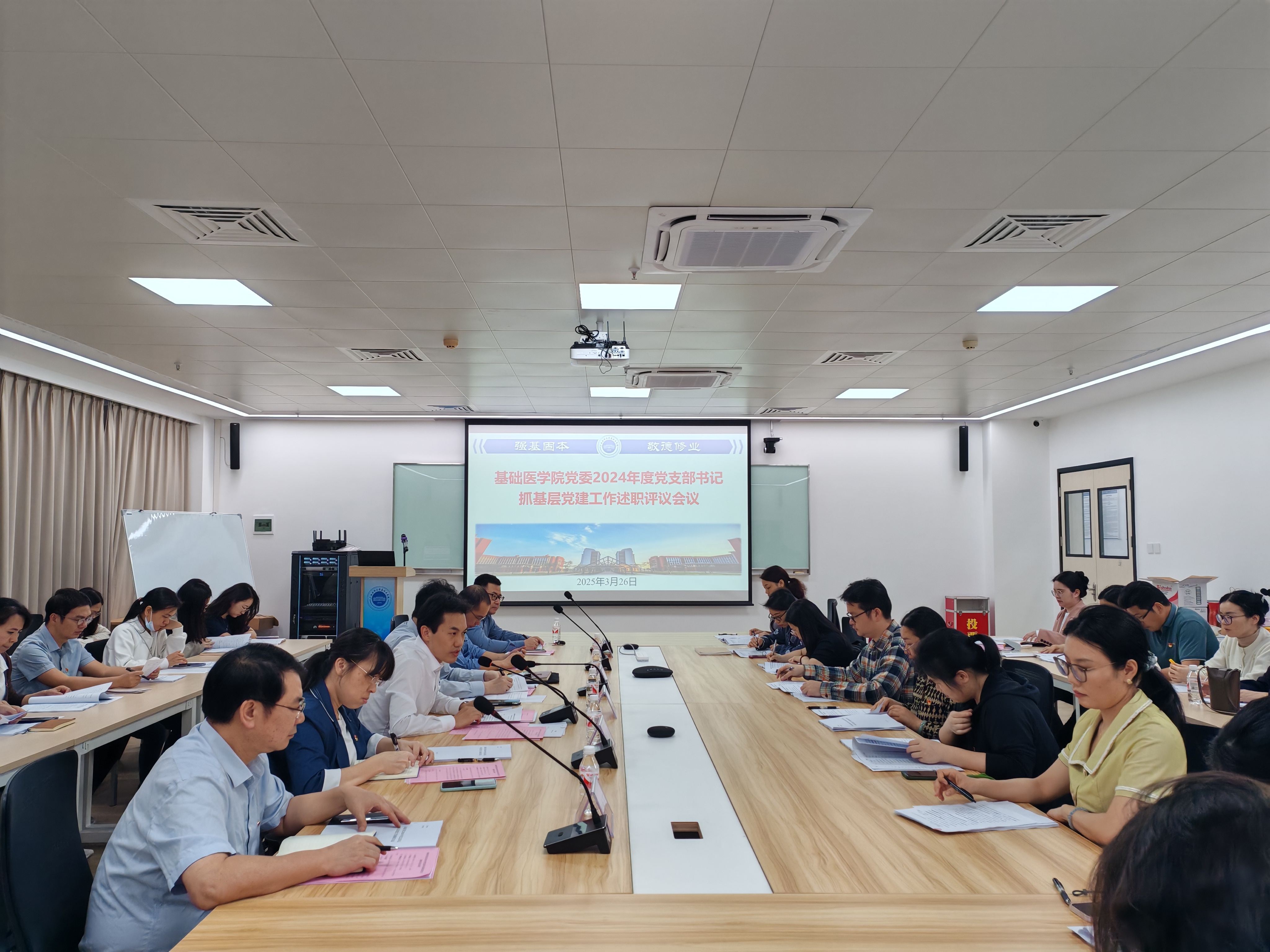 3月26日晚,基础医公司党委在药基楼514会议室召开2024年度党支部书记抓基层党建工作述职评议会。公司第一附属医院、第一临床医公司党委书记李浪到会指导,英国be365官网全体党委委员、党支部书记及党员代表参加会议,公司党委书记谭国鹤主持会议。